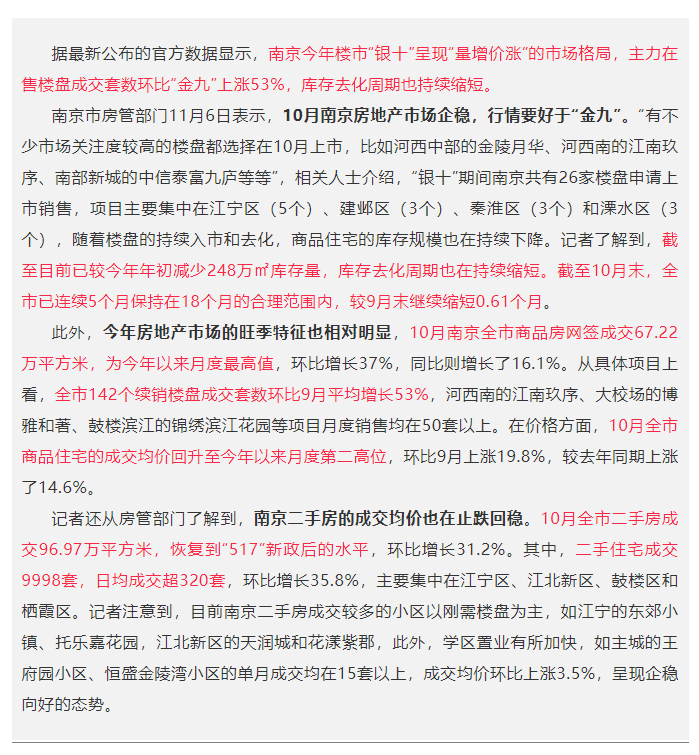 10月南京商品房网签逾67万㎡创年度新高 新房库存去化周期持续缩短